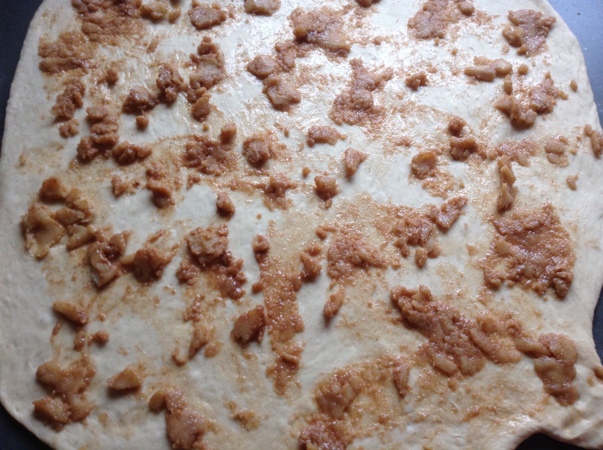 Kjevle ut deigen til en stor rektangel og fordel fyllet oppå