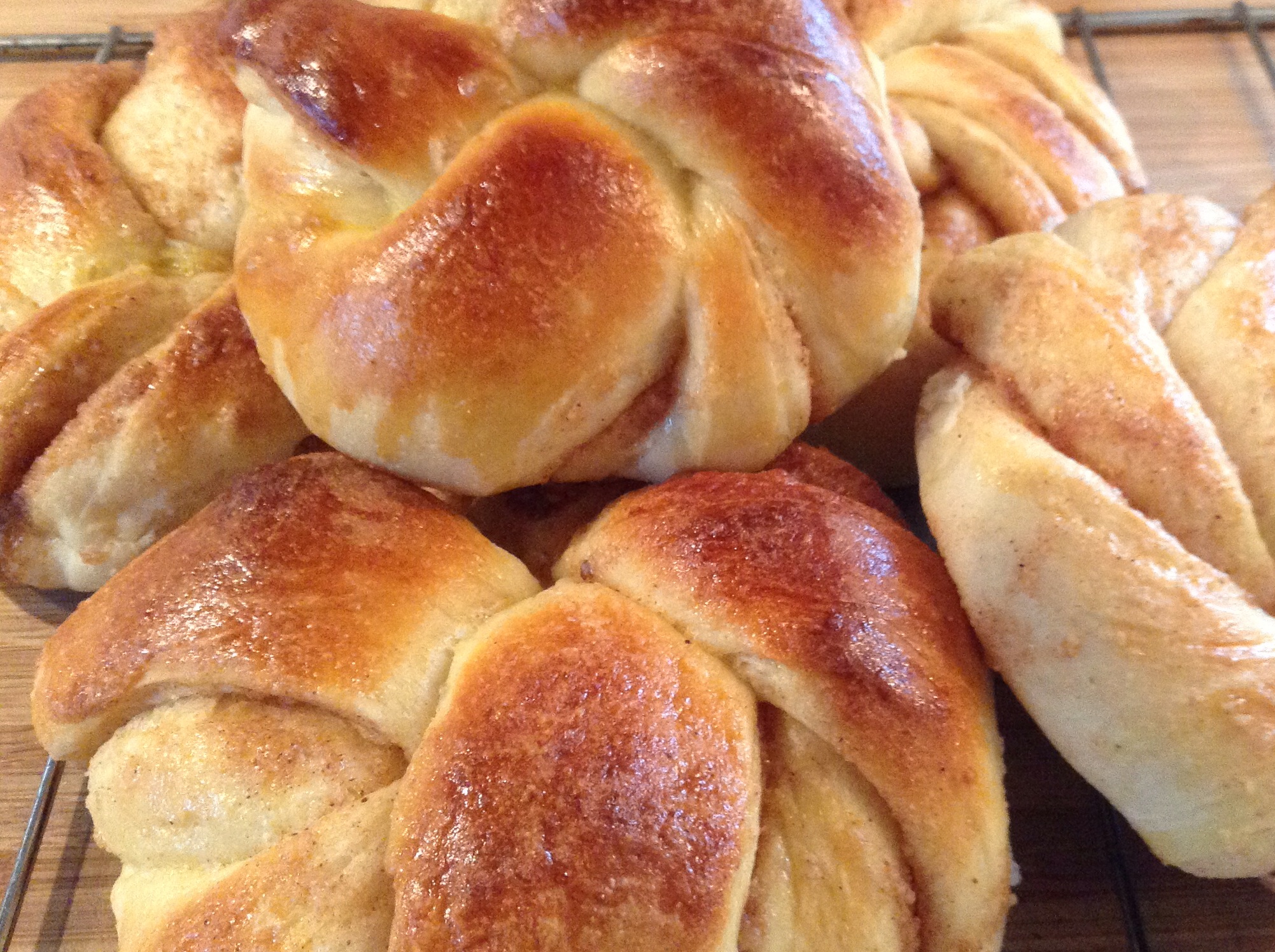 Kok opp melk, smør og melis. Avkjøl blandingen til den er fingervarm (37°C) og tilsett appelsinjuice. Pisk smør og sukker sammen og tilsett marsipan og kanel for fyllet. Rør gjæren ut i væsken eller ha tørrgjær i melet. Bland i kardemomme og speltmel (se tips). Tilsett det tørre til det våte. Elt deigen til den er smidig. Kjevle ut deigen til en firkant og smør fyllet på, brett over en gang og skjær forsiktig 18 strimler. Snurr dem og så lag en knute. Legg dem på bakepapirdekkede stekeplater. La dem heve lunt i 1 time. Pensle med et pisket egg.