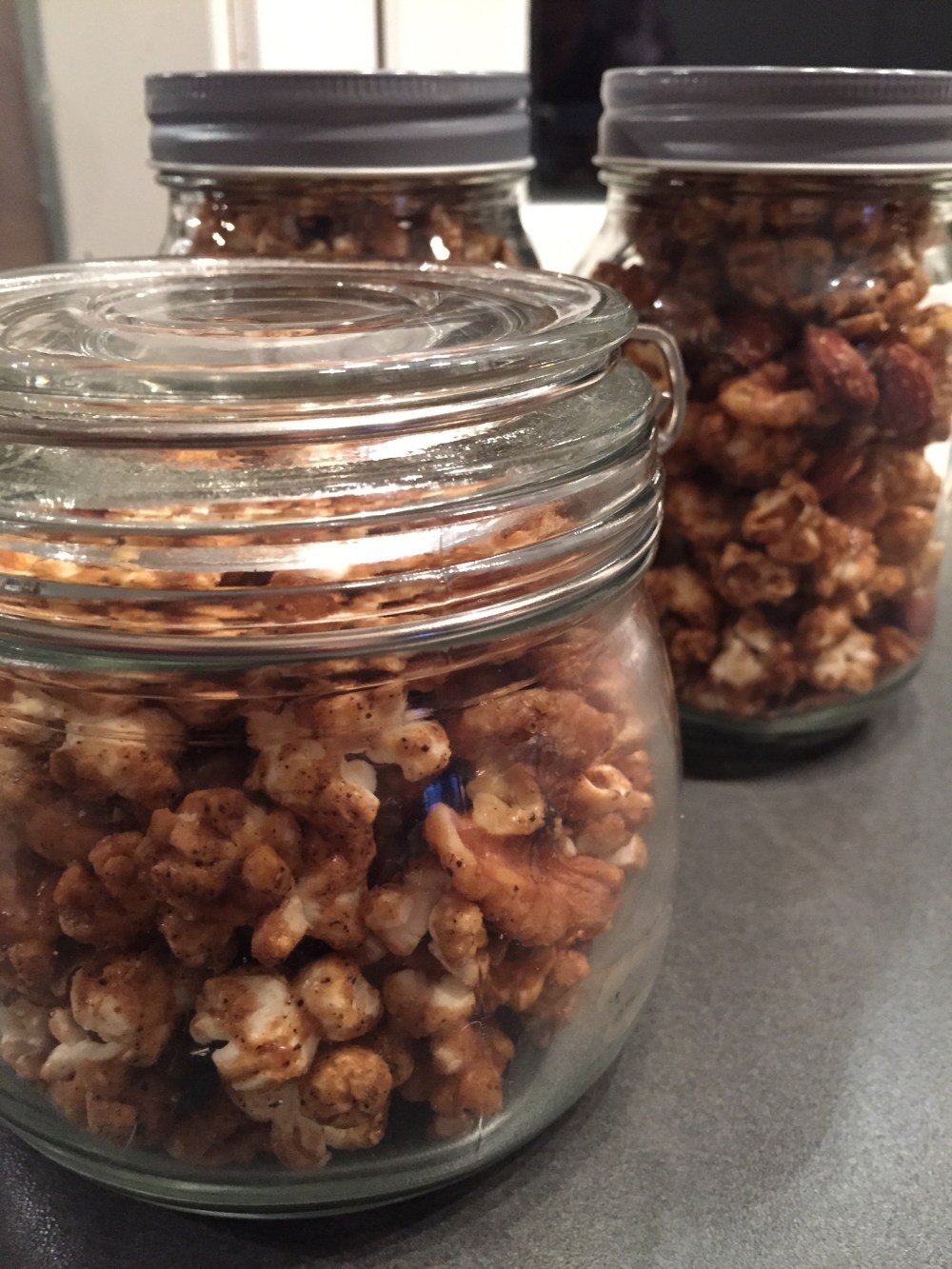 - Putt popkorn og nøtter i en bolle og sett til side.