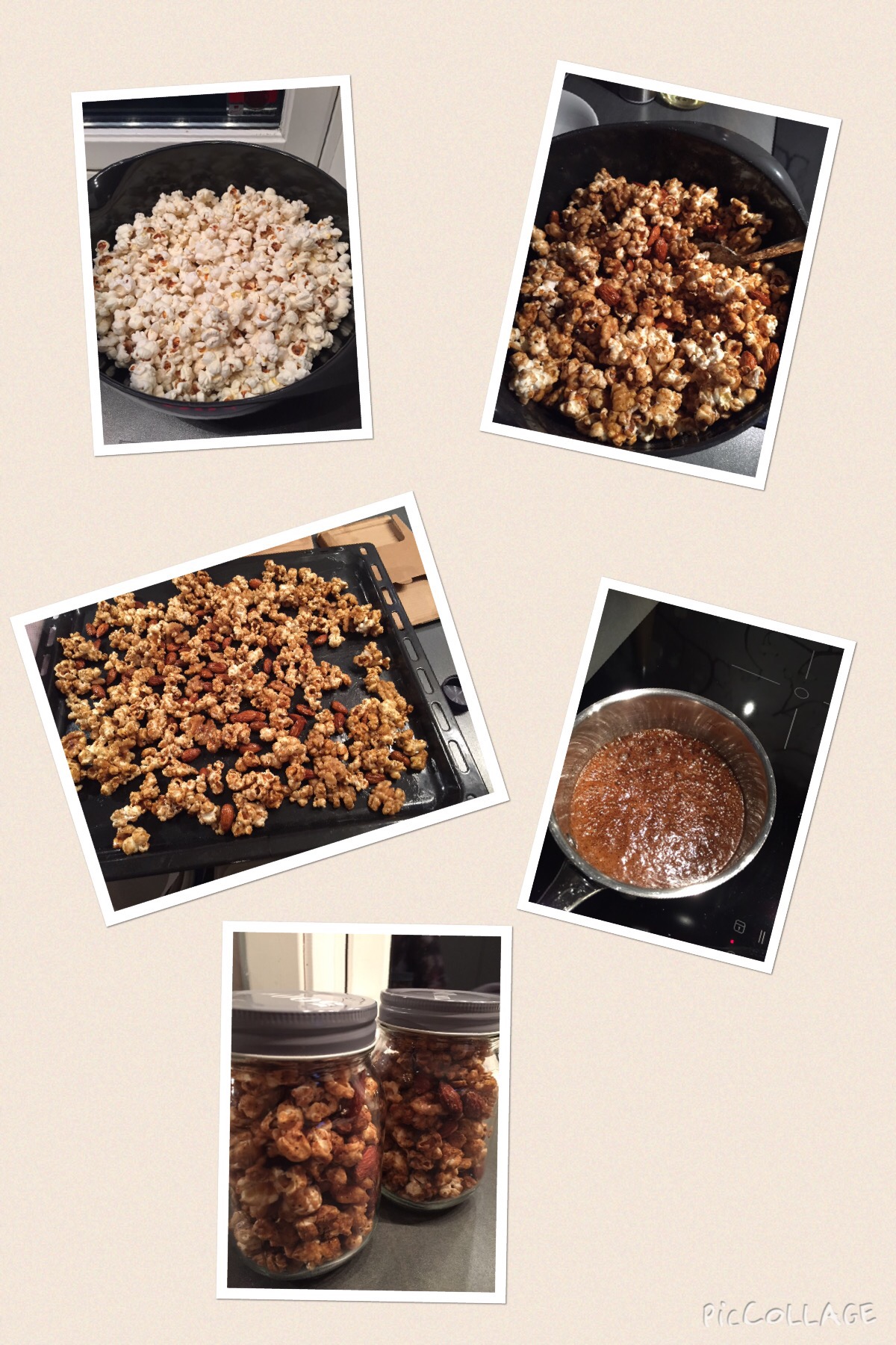 - Hell blandingen litt og litt over popkorn og nøtteblandingen mens du vender det inn. Det stivner fort, så pass på at det blir jevnt fordelt.