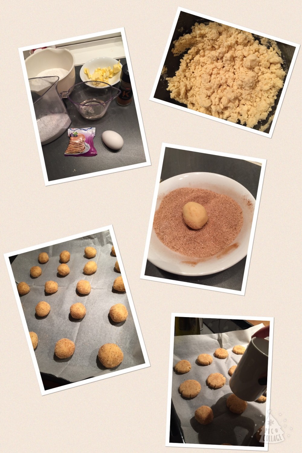 Trill runde kuler med hendene. Rull kulene i sukker- og kanelblandingen. Sett kulene på stekeplate med bakepapir med litt avstand fra hverandre. Press de litt flate med bunnen av et glass eller kopp. De vil sprekke opp litt rundt kantene.
